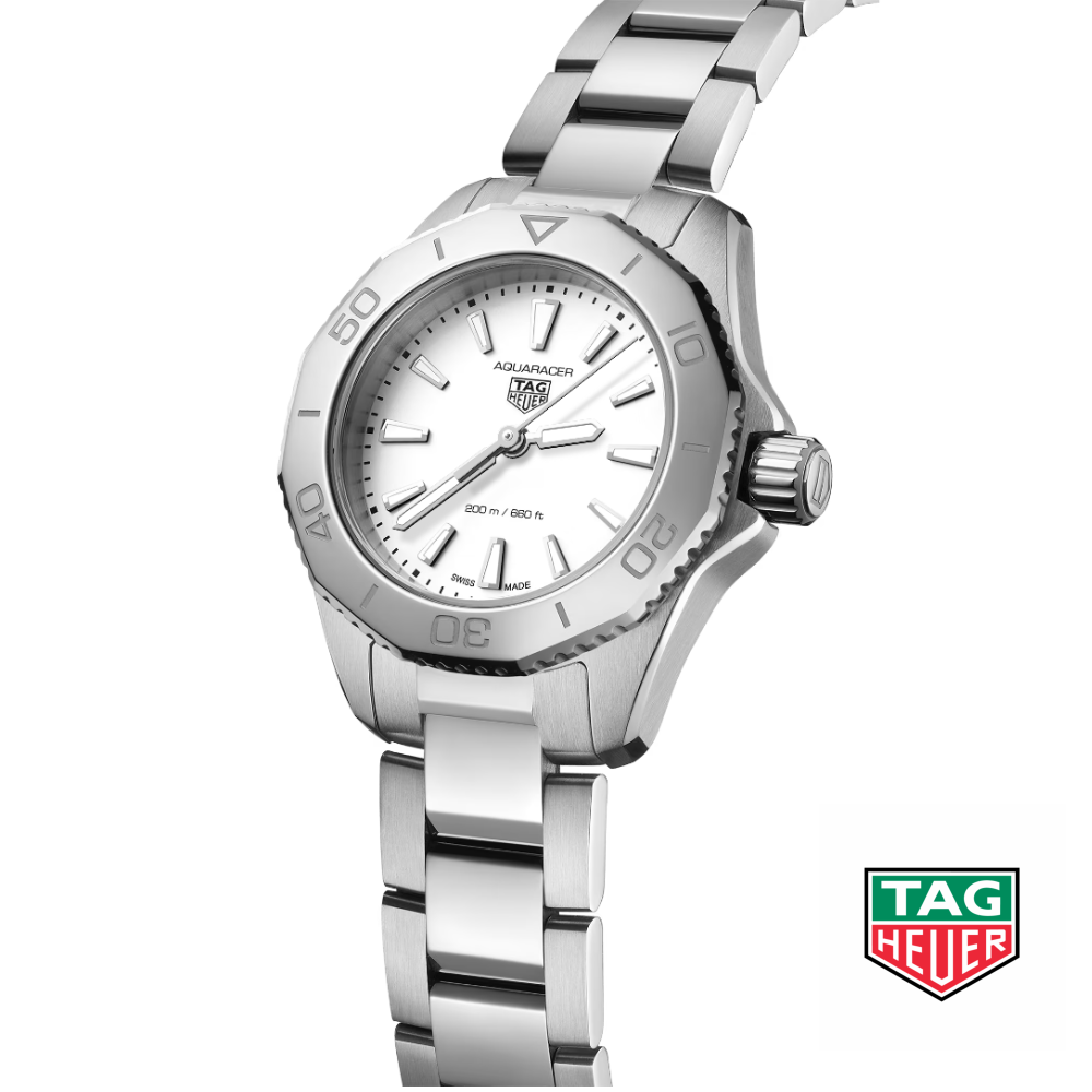 TAG Heuer Aquaracer được thiết kế để sử dụng hàng ngày. Một chiếc đồng hồ công cụ đích thực với phong cách đa năng, sẵn sàng giúp bạn vượt qua giới hạn cá nhân. Mẫu 30mm này nổi bật với mặt số màu bạc lấp lánh và sự táo bạo không thể nhầm lẫn.Phong trào thạch anh cỡ nòng Dự trữ năng lượng thạch anh (giờ) tần số cân bằng, Chức năng Giờ, Phút, Giây, Kích thước 30mm, Khả năng chống nước 200, Trường hợp Thép được chải mịn/đánh bóng, Thép bezel xoay bezel, Thép bắt vít Crown, Vỏ sau bằng thép, Chất liệu dây đeo Thép Màu bạc, Hoàn thiện chải mịn/đánh bóng, Nút bấm khóa gập – Thép