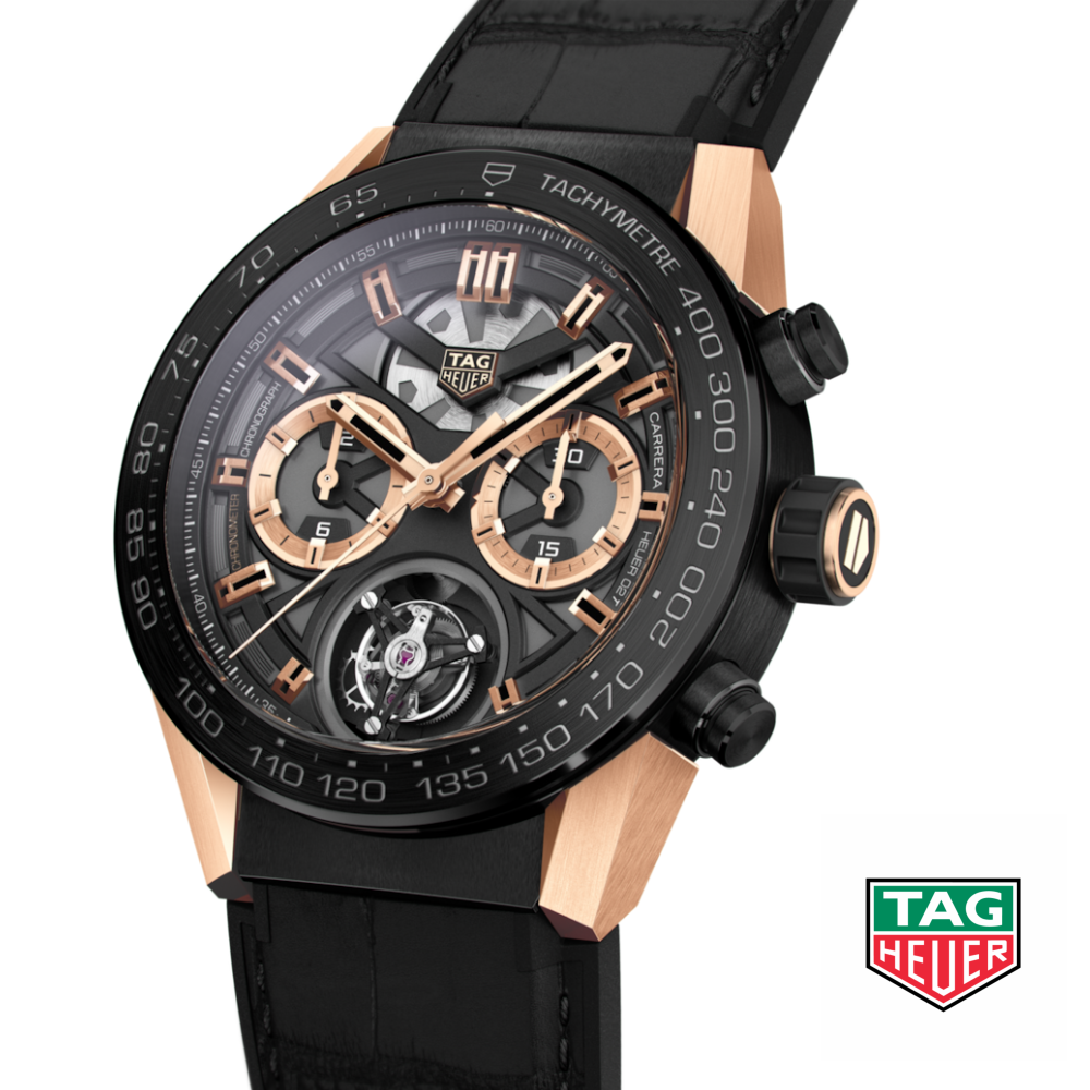 Phiên bản vàng hồng của TAG Heuer Carrera Tourbillon Chronograph với mặt số skeleton màu đen, vỏ titan, vành bezel bằng gốm và vấu bằng vàng hồng. Dây đeo bằng da cá sấu đen mờ được khâu công phu trên cao su đen. Calibre HEUER02T COSC. Bộ máy tự động. Dự trữ năng lượng (giờ) 65. Tần số cân bằng 28'800 (4 Hz). Chức năng Giờ, Phút, Chronograph: 1/4 giây, bộ đếm 30 phút, bộ đếm 12 giờ, Tourbillon 1 phút. Kích thước 45 mm. Độ dày 16,23 mm. Khoảng cách vấu 22 mm. Khả năng chống nước 100 m. Vỏ Titanium PVD đánh bóng/chải mịn. Vành bezel: Vành bezel cố định: Titanium & Gốm. Chất liệu dây đeo: Cao su & Da. Màu đen. Hoàn thiện: Hiệu ứng da cá sấu. Khóa: Khóa gập: Nút bấm – Titan phun cát cấp 2. Hoàn thiện: Opalin. Mặt số: Màu đen