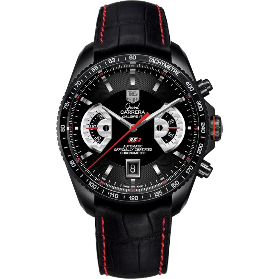 Kiểu dáng màu đen bóng bẩy và Hệ thống xoay độc quyền khiến Grand Carrera Calibre 17 RS2 Chronograph tự động trở thành một sản phẩm không thể thiếu đối với những người sành về đồng hồ bấm giờ và xe đua. Lấy cảm hứng từ thiết kế động cơ xe đua GT, Hệ thống xoay TAG Heuer thay thế các kim truyền thống bằng các đĩa kiểu bảng điều khiển: khả năng đọc là tối ưu trong khi vẫn duy trì sự sang trọng dễ dàng. Trên Grand CARRERA Calibre 17 RS2, hệ thống xoay hiển thị kim giây cố định ở vị trí 3 giờ và phút bấm giờ ở vị trí 9 giờ. Ngày hiển thị ở vị trí 6 giờ. Model này được phủ titan loại 2 bằng cacbua titan. Có một tinh thể sapphire được lắp vào vỏ sau để lộ bộ chuyển động.