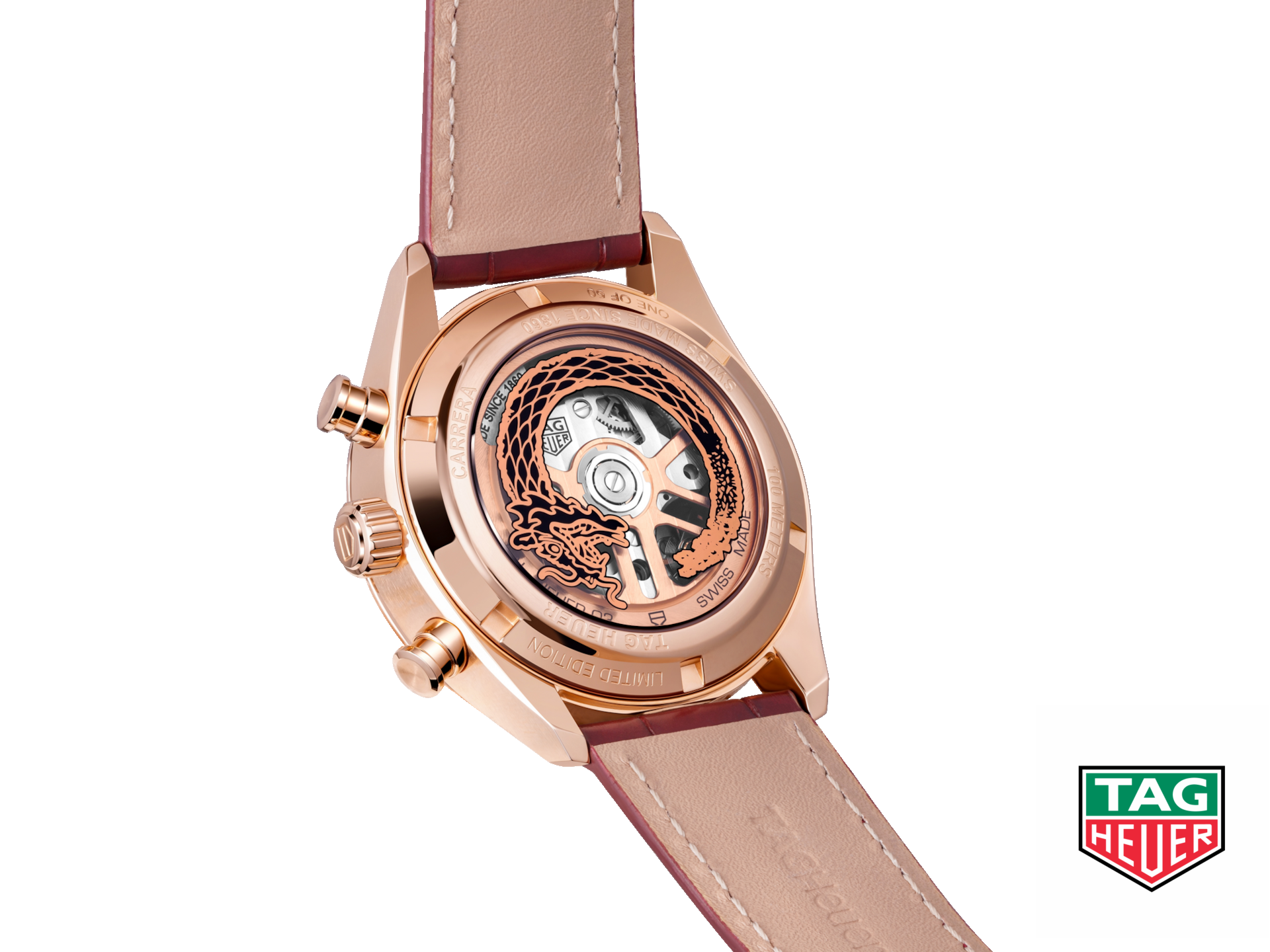 Để tôn vinh năm con rồng một cách táo bạo và thanh lịch, phiên bản vàng hồng 18k 5n của chiếc tag heuer carrera này kết hợp sự giàu có của năm mới âm lịch và sự thành công được thể hiện bởi con rồng, điều này tương đồng một cách không thể nhầm lẫn với câu chuyện thành công của tag heuer carrera.