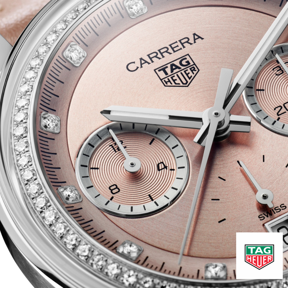 Với đường kính 39mm, chiếc đồng hồ bấm giờ TAG Heuer Carrera này nắm bắt được bản chất của sự nữ tính và tinh thần đua xe. Với mặt số màu hồng nhạt nổi bật trên nền kim cương sáng chói, chiếc đồng hồ này toát lên vẻ sang trọng, thể thao. Calibre TH20-00. Bộ máy Tự động. Bộ máy nội bộ Có. Dự trữ năng lượng (giờ) 80. Tần số cân bằng 28800 (4Hz). Chức năng Giờ, Phút, Giây, Chronograph: 1/4 giây, bộ đếm 30 phút, bộ đếm 12 giờ, Ngày. Kích thước 39 mm. Độ dày 13,9 mm. Khoảng cách vấu 20,7 mm. Khả năng chống nước 100m. Vỏ thép được chải mịn/đánh bóng. Núm điều chỉnh bằng thép. Mặt sau trơn – Thép. Trọng lượng kim cương vỏ 0,453. Số lượng kim cương vỏ 72. Chất liệu dây đeo bằng da. Màu hồng. Khóa gập – Thép đánh bóng. Hoàn thiện chải tròn. Màu hồng. Chỉ số được áp dụng. Trọng lượng kim cương mặt số 0,107. Số lượng kim cương mặt số 11