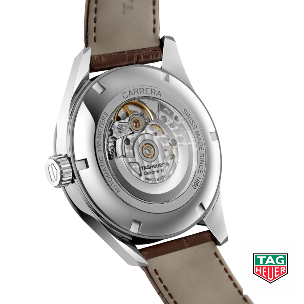 The white dial is the perfect foil for the burnished glow of the rose-gold second hand, indexes, hour and minute hands, TAG Heuer logo and Day-Date window at 3 o’clock.Đường kính vỏ: 41 mm. Viền thép cố định được đánh bóng. Vương miện được đánh bóng với logo TAG Heuer.Vỏ sapphire chống trầy xước. Khả năng chống nước: 100 mét. Vỏ thép được đánh bóng. TAG Heuer Calibre 5, Sản xuất tại Thụy Sĩ. Tự động hiệu chuẩn, chỉnh ngày nhanh chóng. Đường kính: 26 mm (11 ½''') — 25 đến 26 viên hồng ngọc tùy theo cách thực hiện.Tần số cân bằng:28.800 rung động mỗi giờ (4 Hz). Dự trữ năng lượng: 38 giờ