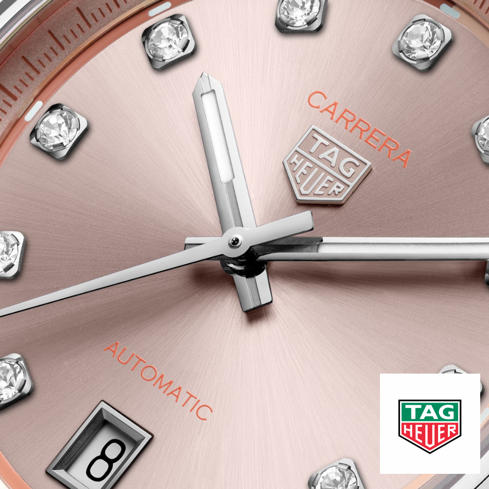 Giới thiệu mẫu đồng hồ TAG Heuer Carrera Date 36mm với mặt số màu hồng phấn nhẹ nhàng. Mẫu đồng hồ thanh lịch này sở hữu các cọc số đính kim cương và được trang bị bộ máy Calibre 7, khiến nó vừa quý giá vừa vượt thời gian. Calibre Calibre 7 Tự động. Bộ máy Tự động. Dự trữ năng lượng (giờ) 50. Chức năng: Giờ, Phút, Giây, Ngày. Kích thước 36 mm. Độ dày 10,2 mm. Khoảng cách càng nối dây 19 mm. Khả năng chống nước 50 m. Vỏ thép Đánh bóng/Chải mịn. Núm chỉnh giờ bằng thép. Mặt sau bằng Sapphire – Thép. Chất liệu dây đeo: Thép. Màu bạc. Hoàn thiện: Đánh bóng/Chải mịn. Khóa gập – Nút bấm – Thép. Hoàn thiện: Đánh bóng tia mặt trời. Màu hồng. Có vạch chia. Trọng lượng kim cương mặt số: 0,220. Số lượng kim cương mặt số: 11