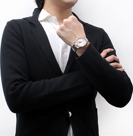 - Mặt đồng hồ tông màu bạc với các cọc số tông vàng hồng, ba kim, điểm nhấn dạ quang, cửa sổ ngày và logo