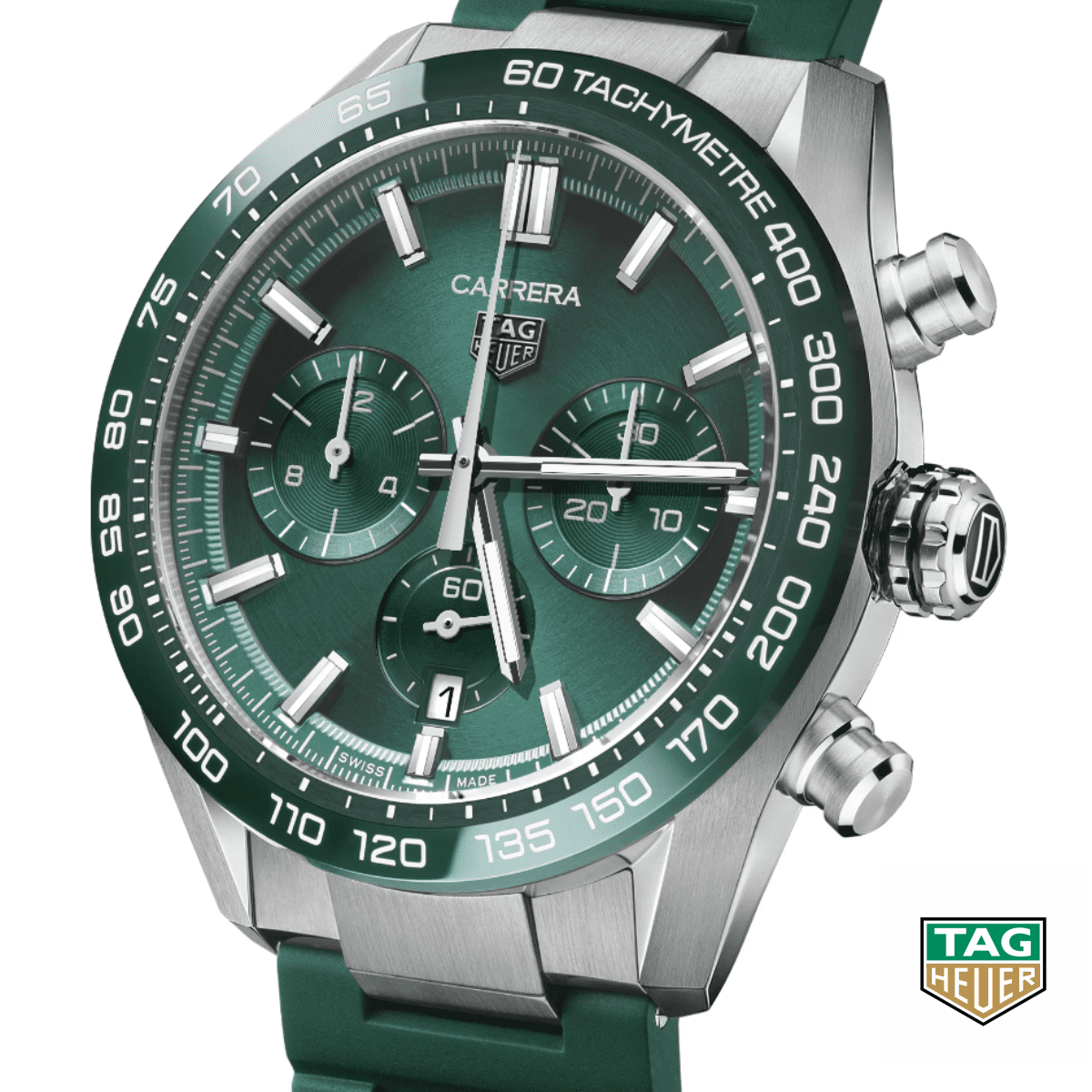 Vỏ thép không gỉ tông màu bạc với dây đeo cao su màu xanh lá cây. Viền cố định bằng thép không gỉ màu xanh lá cây. Mặt số hình tròn màu xanh lá cây được chải xước với các kim có tông màu bạc và vạch chỉ giờ. Thang đo Tachymeter quanh vành ngoài. Loại mặt số Kim và vạch đánh dấu phát quang. Ngày hiển thị ở vị trí 6 giờ. Chronograph – ba mặt số phụ hiển thị: 60 giây, 30 phút và 12 giờ. Bộ chuyển động tự động Heuer Calibre 02, chứa 33 viên Ngọc, gồm 168 bộ phận, hoạt động ở tốc độ 28800 vph và có khả năng dự trữ năng lượng khoảng 75 giờ. Tinh thể sapphire chống trầy xước. Ốp lưng trong suốt nhìn xuyên thấu. Kiểu dáng vỏ tròn, kích thước vỏ: 44 mm. Chống nước ở độ sâu 100 mét / 330 feet. Chức năng: đồng hồ bấm giờ, bánh xe cột, ngày, giờ, phút, giây nhỏ, đồng hồ bấm giờ. Dòng đồng hồ bấm giờ Carrera. Kiểu dáng đồng hồ sang trọng. Nhãn đồng hồ: Swiss Made. Đồng hồ nam tự động Chronometer Tag Heuer Carrera Chronograph