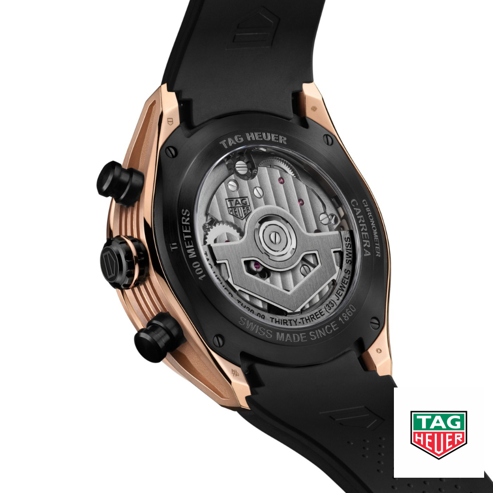 Hãy đón nhận sự kết hợp hoàn hảo giữa sang trọng và hiệu suất với TAG Heuer Carrera Chronograph Tourbillon, hiện thân ấn tượng của niềm đam mê đua xe thể thao. Với sự kết hợp tinh tế giữa vàng hồng nguyên khối 18K 5N và titan cấp độ 2, chiếc đồng hồ này tái định nghĩa tinh hoa của đồng hồ thể thao cao cấp. Calibre TH20-09 COSC. Bộ máy Tự động. Bộ máy nội bộ Có. Dự trữ năng lượng (giờ) 65. Tần số cân bằng 28800 (4Hz). Chức năng Giờ, Phút, Chronograph: 1/4 giây, bộ đếm 30 phút, bộ đếm 12 giờ, Tourbillon 1 phút. Kích thước 44 mm. Độ dày 15,1 mm. Khoảng cách vấu 22,1 mm. Khả năng chống nước 100 m. Vỏ Vàng & Titan Đánh bóng/Bóng mịn/Phun cát. Núm điều chỉnh DLC Titanium đen. Mặt sau bằng Sapphire – Titan DLC đen. Chất liệu dây đeo Cao su. Màu đen. Hoàn thiện: Phun cát. Khóa gập Khóa bấm – Titan DLC đen. Hoàn thiện: Đánh bóng mịn. Màu vàng 5N & Đen