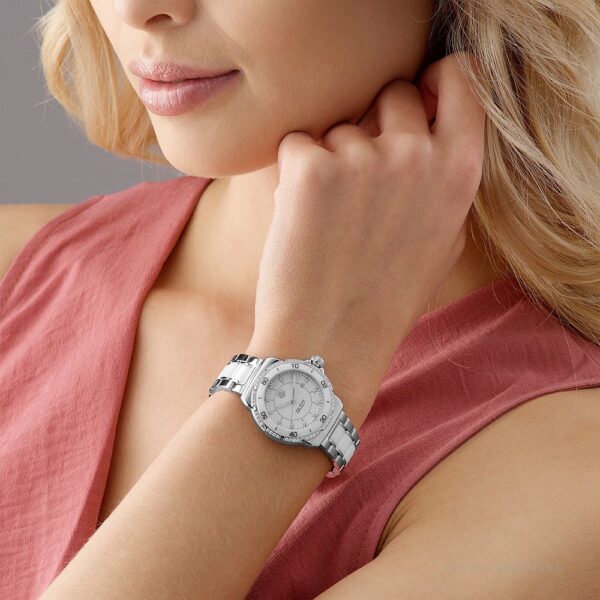 - Mặt số màu trắng với điểm nhấn kim cương, kim màu bạc và cửa sổ ngày