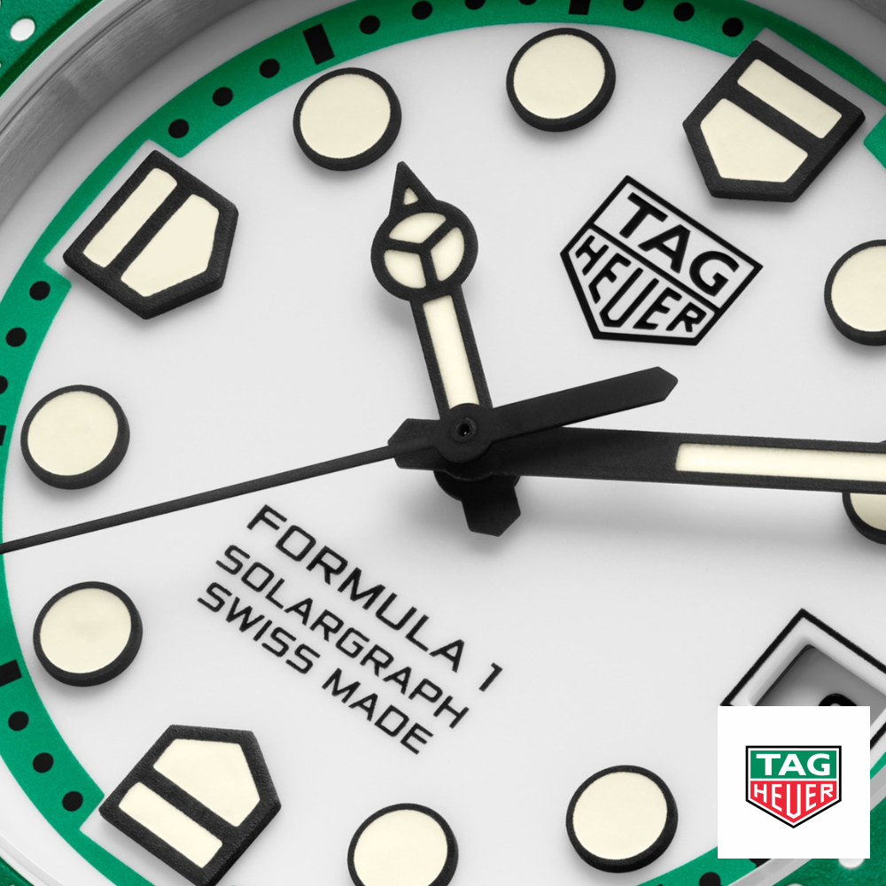 Thiết kế độc đáo, lấy cảm hứng từ màu sắc nổi bật với TAG Heuer Formula 1 Solargraph (38mm). Sự kết hợp ấn tượng giữa màu đỏ và xanh lá cây TH-Polylight khiến chiếc đồng hồ phiên bản giới hạn độc quyền này trở thành một sự bổ sung thú vị cho bộ sưu tập Công thức 1, mang đến hiệu suất năng lượng mặt trời và vẻ ngoài năng động, vui tươi. Caliber TH50-00. Bộ máy Solar Quartz. Chức năng Giờ, Phút, Giây, Ngày. Kích thước 38 mm. Độ dày 9,9 mm. Khoảng cách vấu 18,5 mm. Khả năng chống nước 100 m. Vỏ TH-Polylight được phun cát. Vành bezel xoay Vành bezel TH-Polylight. Núm chỉnh giờ bằng thép. Mặt sau bằng thép trơn. Chất liệu dây đeo bằng cao su. Màu xanh lá cây. Khóa cài – Thép. Hoàn thiện bằng Opalin. Màu trắng