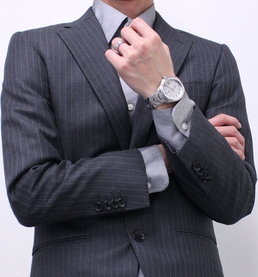 - Mặt đồng hồ có tông màu bạc sọc dọc với các cọc số và logo được áp dụng