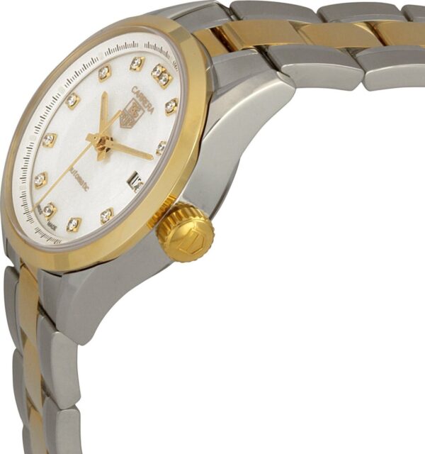 - Mặt số xà cừ với các điểm nhấn kim cương, kim màu vàng và cửa sổ ngày