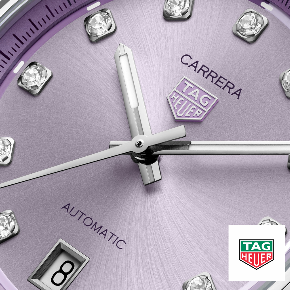 Đồng hồ TAG Heuer Carrera Date 36mm mang đến nét tươi mới cho bộ sưu tập với mặt số màu tử đinh hương quyến rũ. Với các vạch chỉ giờ nạm kim cương và được trang bị bộ máy Calibre 7, chiếc đồng hồ này là sự kết hợp hoàn hảo giữa vẻ thanh lịch và độ chính xác. Bộ máy Calibre 7 Automatic. Bộ máy Automatic. Dự trữ năng lượng (giờ): 50. Chức năng: Giờ, Phút, Giây, Ngày. Kích thước: 36 mm. Độ dày: 10,2 mm. Khoảng cách càng nối dây: 19 mm. Khả năng chống nước: 50 m. Vỏ: Thép, Đánh bóng/Chải mịn. Núm điều chỉnh: Thép. Mặt sau: Sapphire – Thép. Chất liệu dây: Thép. Màu bạc. Hoàn thiện: Đánh bóng/Chải mịn. Khóa gập: Thép. Nút bấm – Thép. Hoàn thiện: Snailed. Màu tím. Vạch chỉ giờ: 0,220. Số lượng kim cương trên mặt số: 11
