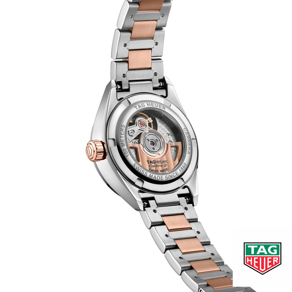 Phiên bản mang tính biểu tượng và phong cách này của TAG Heuer Carrera mang tính biểu tượng kết hợp vàng hồng nguyên khối 18K 5N và thép với 11 viên kim cương 1,30mm (0,088ct). Trên mặt số xà cừ tinh tế: màn hình hiển thị ngày ở vị trí 6 giờ, kim và vạch chỉ giờ phủ Super-Luminova®.