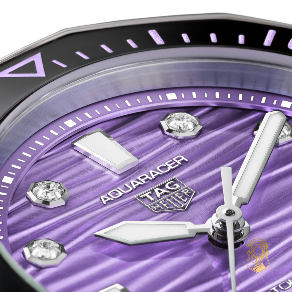 TAG Heuer Aquaracer Professional 300 Date lấy cảm hứng từ màu sắc rực rỡ của những rạn san hô dưới đáy đại dương. Với mặt số màu tím nổi bật và điểm nhấn kim cương, chiếc đồng hồ lặn này là sự kết hợp hoàn hảo giữa vẻ thanh lịch và chức năng mạnh mẽ, được thiết kế để hoạt động dưới nước và tỏa sáng trên bờ. Bộ máy Calibre 5 Automatic. Bộ máy Automatic. Dự trữ năng lượng (giờ): 38. Tần số dao động: 28.800 (4 Hz). Chức năng: Giờ, Phút, Giây, Ngày. Kích thước 36 mm. Độ dày 11,4 mm. Khoảng cách vấu 17,4 mm. Khả năng chống nước 300 m. Vỏ thép được chải mịn/đánh bóng. Vành bezel xoay bằng gốm. Mặt sau bằng thép trơn. Chất liệu dây đeo bằng thép. Màu bạc. Hoàn thiện được chải mịn/đánh bóng. Khóa gập – Nút bấm – Thép. Hoàn thiện được sơn mài. Màu tím. Có vạch chia độ. Trọng lượng kim cương trên mặt số 0,077. Số lượng kim cương trên mặt số là 8