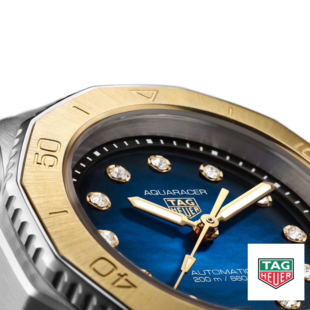 Mặt số xà cừ màu xanh khói đặc trưng của chiếc đồng hồ TAG Heuer Aquaracer này được tôn lên nhờ các chi tiết bằng vàng nguyên khối 18K 3N và kim cương lấp lánh. Khả năng chống nước ở độ sâu 200 mét và dây đeo bằng thép chắc chắn đảm bảo hiệu suất lâu dài. Calibre Calibre 9 Tự động. Bộ máy Tự động. Dự trữ năng lượng (giờ) 40. Tần số cân bằng 28'800 (4 Hz). Chức năng giờ, phút, giây, ngày. Kích thước 30 mm. Khả năng chống nước ở độ sâu 200 m. Vỏ thép được chải mịn/đánh bóng. Vành bezel xoay bằng thép và vàng. Núm vặn bằng vàng nguyên khối 18K 3N. Nắp lưng trơn – Thép. Chất liệu dây đeo bằng thép. Màu bạc. Hoàn thiện được chải mịn/đánh bóng. Khóa gập – Thép. Hoàn thiện màu khói. Màu xanh lam và trắng. Chỉ số được áp dụng. Trọng lượng kim cương trên mặt số 0,106. Số lượng kim cương trên mặt số 11